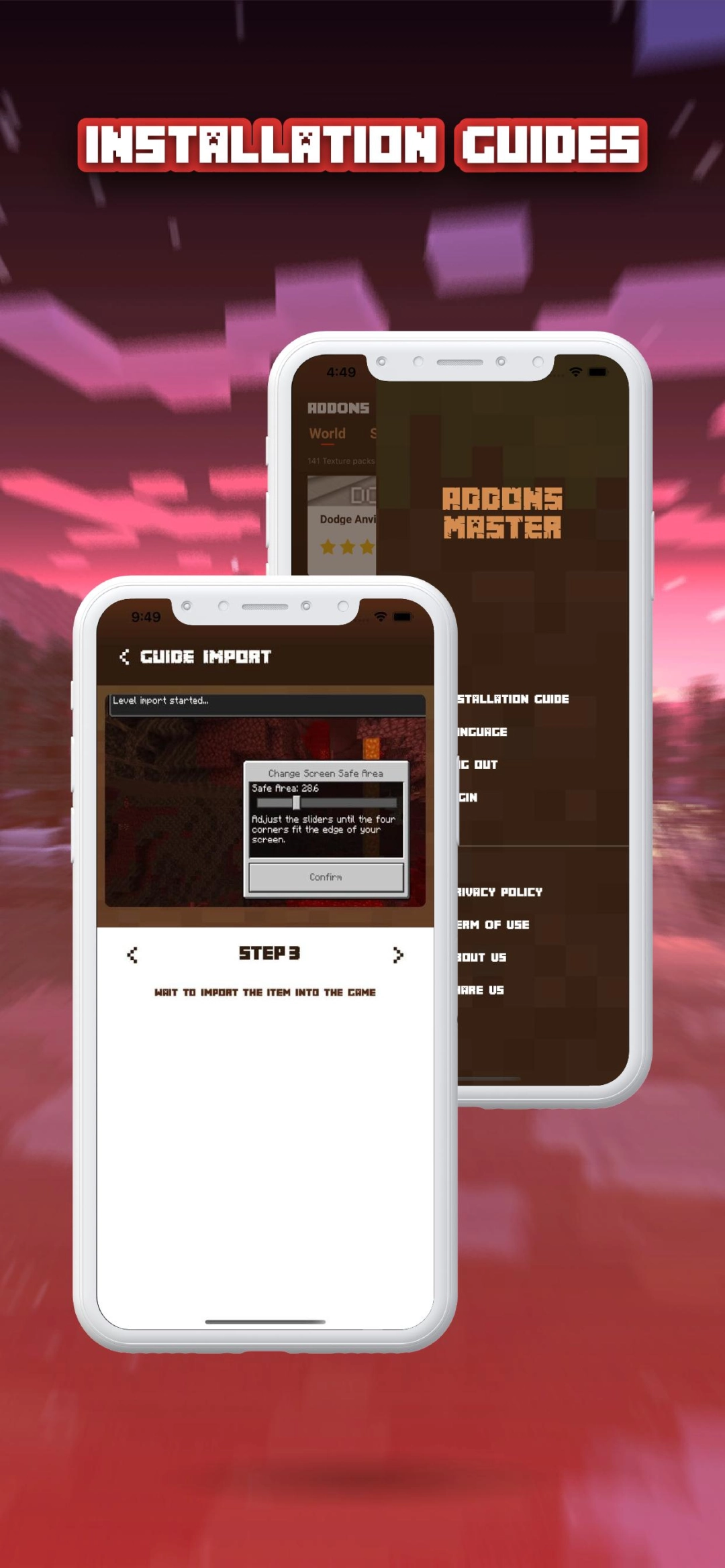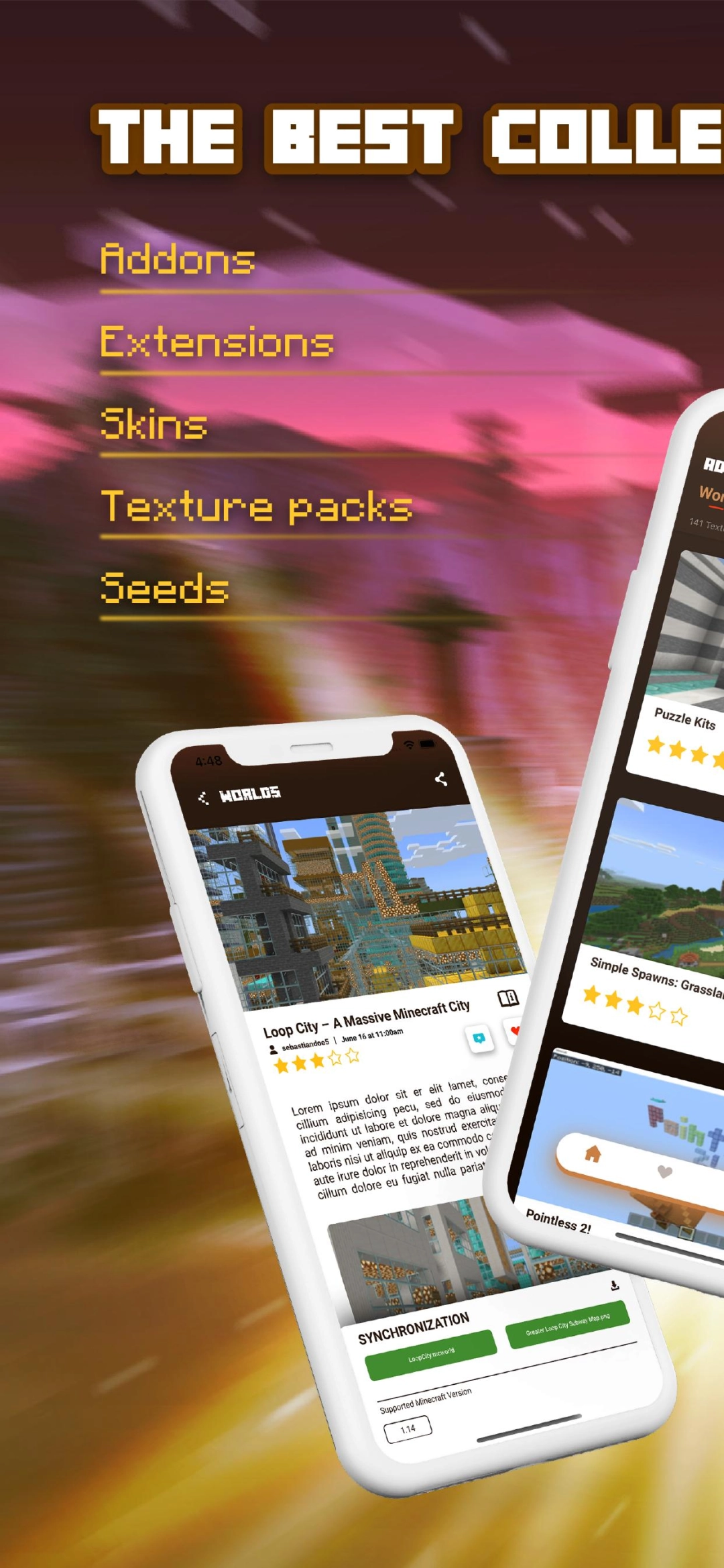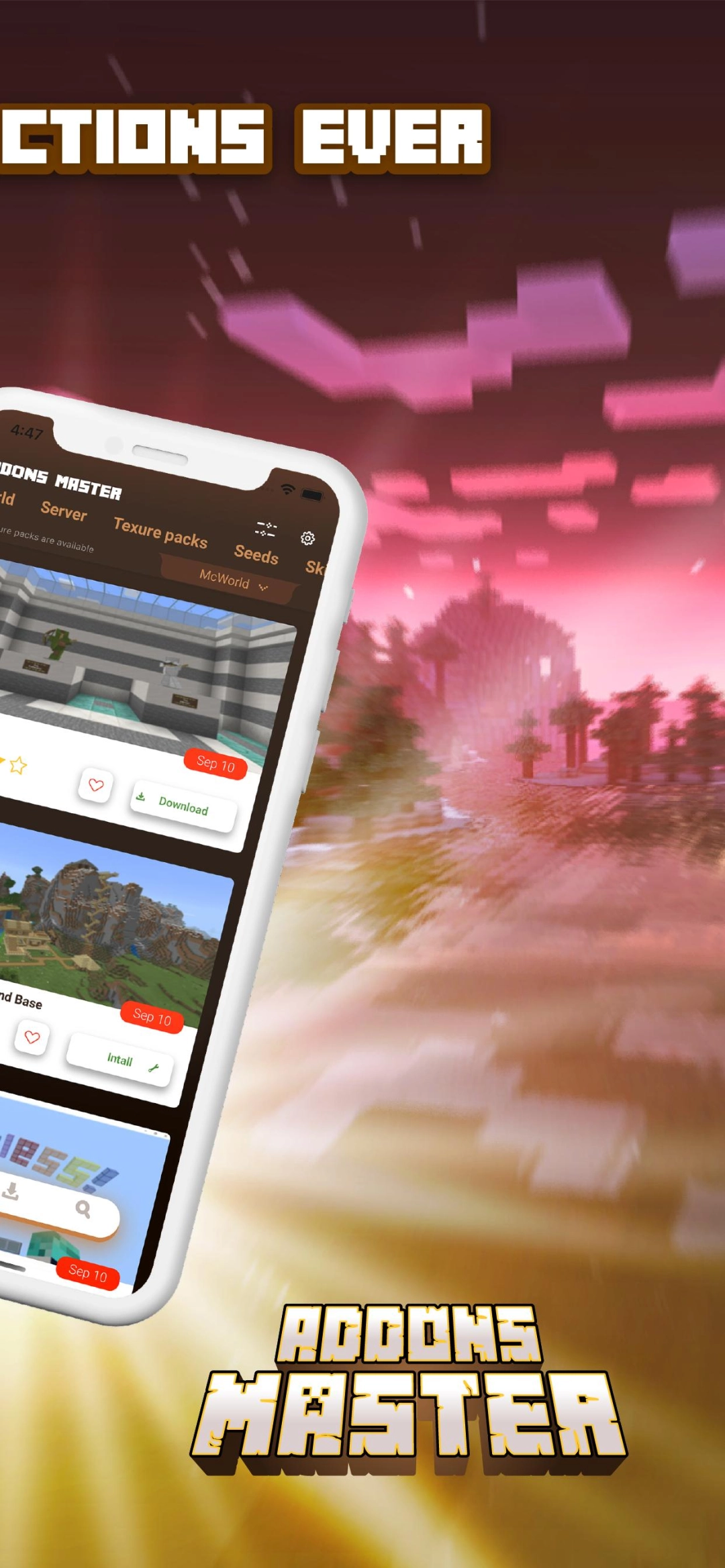 This application requires Minecraft Pocket Edition<br><br>Addons: Minecraft mods, MCPE addons, maps, skins is a free utility launcher for MC PE where you will find all the newest maps, addons, sideways, servers, wallpapers, skins, mods, as well as craftin